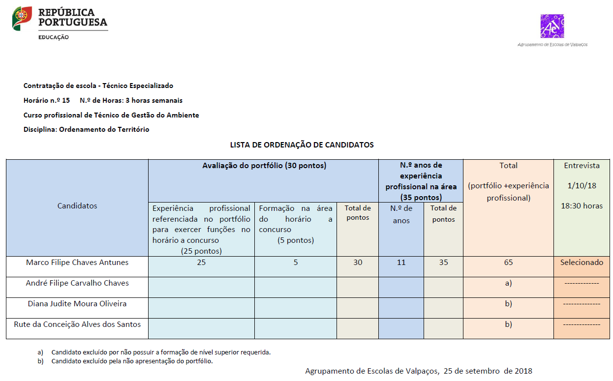 Publica-se a lista ordenada de candidatos à contratação de escola - Horário nº 15, para contratação de Técnico Especializado.