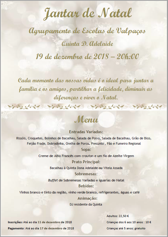 A Diretora convida todo o pessoal docente, não docente e demais colaboradores a participarem no jantar de Natal do Agrupamento que se realizará no próximo dia 19 de dezembro, pelas 20h00, na Quinta Dª. Adelaide.
